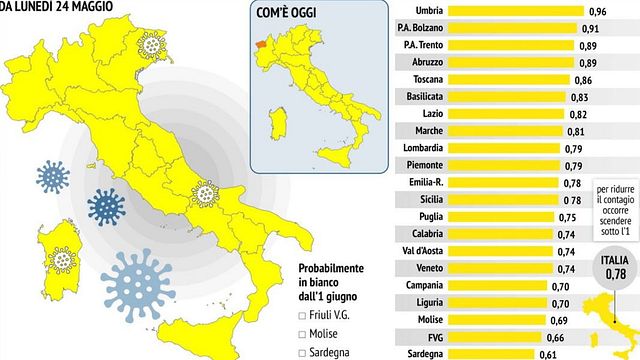 Dal 24 maggio tutte le Regioni e Province autonome sono in zona gialla. Il ministro della Salute, Roberto Speranza, sulla base dei dati e delle indicazioni della Cabina di Regia, firmerà in giornata una nuova ordinanza che entrerà in vigore a partire da lunedì. La decisione arriva dopo la pubblicazione degli ultimi dati del monitoraggio settimanale sull'indice Rt nazionale che è sceso sotto quota 1, a 0,78.