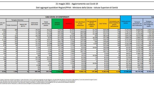 I numeri della pandemia - In totale i casi dall'inizio dell'epidemia sono 4.183.476, i morti 125.028. I dimessi e i guariti sono in tutto 3.766.660, con un incremento di 12.695 unità nelle ultime 24 ore. Gli attualmente positivi in Italia sono 291.788, in calo di 7.698 rispetto a giovedì. In isolamento domiciliare ci sono 280.394 persone (-7.165 rispetto al giorno precedente).