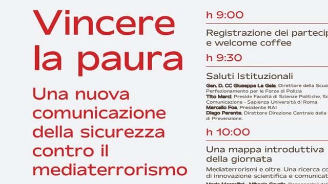 Si svolgerà il 31 maggio dalle ore 9 alle ore 14, presso l'Auditorium "Carlo Mosca" della Scuola di Perfezionamento per le Forze di Polizia, il seminario di studio "Vincere la paura. Una nuova comunicazione della sicurezza contro il mediaterrorismo". L'obiettivo è quello di interpretare e contrastare le distorsioni presenti nelle narrazioni dei media e accompagnare gli operatori della sicurezza e dello spazio pubblico in contesti complessi come terrorismo, migrazioni, criminalità e pandemia.