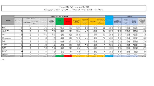 Sono 2.483 i nuovi casi di coronavirus registrati in Italia a fronte di 221.818 tamponi eseguiti. Il tasso di positività si attesta all'1,1%, in calo rispetto al 2,1% di lunedì. Nelle ultime 24 ore i decessi sono stati 93, per un totale di 126.221 dall'inizio della pandemia. I guariti odierni sono 10.313. Scendono sotto quota mille le terapie intensive (989 in tutto), in calo di 44 unità rispetto a lunedì.