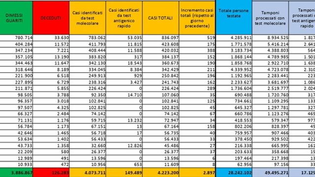 In totale i casi dall'inizio dell'epidemia sono 4.225.163, mentre i dimessi e guariti 3.893.259. Gli attualmente positivi scendono a 205.562, in calo di 4.488 unità nelle ultime 24 ore.