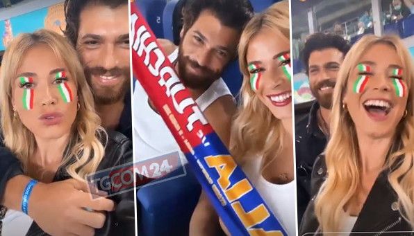 Insieme in tribuna, Diletta e Can condividono una sciarpa dedicata per metà all'Italia e per metà alla Turchia. Si abbracciano e ridono salutando i follower, entrambi in canotta bianca e giubbotto di pelle nera. La conduttrice usa un filtro che le disegna il tricolore sul viso, tanto per non lasciare dubbi su quale sia la squadra che le fa battere il cuore. Insieme alla coppia ci sono altre celebrità, tra cui Fabio Rovazzi che si lancia nelle danze.
