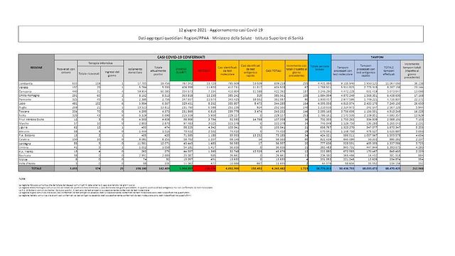 Sono 1.723 i nuovi casi di coronavirus registrati in Italia a fronte di 212.966 test eseguiti. Il tasso di positività si attesta allo 0,8%%, in calo rispetto allo 0,9% di venerdì. Nelle ultime 24 ore i decessi sono stati 52 per un totale di 126.976 dall'inizio della pandemia. I guariti odierni sono 4.500.