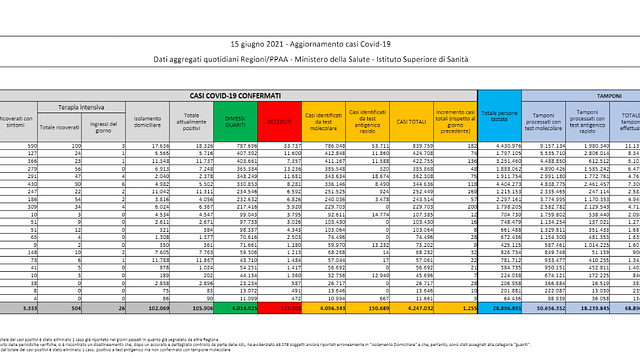 In Italia ci sono 1.255 nuovi casi di coronavirus a fronte di 212.112 tamponi effettuati (mentre il giorno precedente l'incremento era stato di 907 su 79.524 test). Nelle ultime 24 ore sono stati registrati altri 63 decessi (contro i 36 di lunedì) per un totale, da inizio pandemia, che arriva a 127.101. In terapia intensiva ci sono 504 pazienti (-32) mentre i guariti sono 53.074. Tasso di positività allo 0,6%.