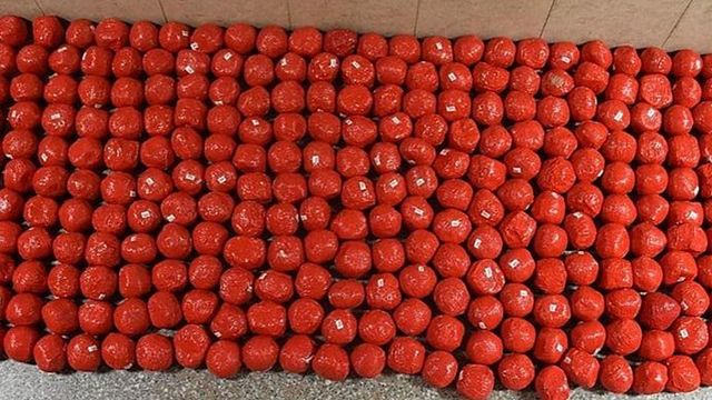 I 64 chili di hashish, confezionati in panetti rivestiti in un involucro rosso, erano stati marchiati con l'emblematico logo presumibilmente per passare inosservati durante eventuali controlli.