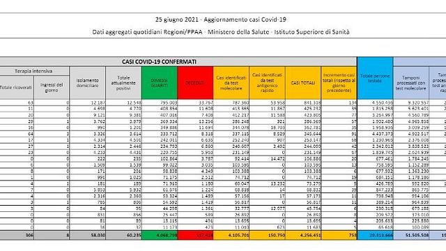 I numeri dell'epidemia in Italia I casi in Italia dall'inizio dell'epidemia sono 4.256.451, i morti 127.418. I dimessi e i guariti sono invece 4.068.798, con un incremento di 2.769 rispetto al giorno precedente, mentre gli attualmente positivi scendono a 60.235, in calo di 2.074 nelle ultime 24 ore. In isolamento domiciliare ci sono 58.030 persone (-1.924).