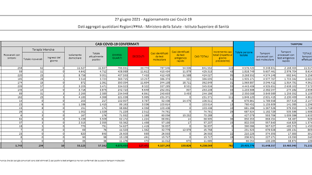 I casi in Italia dall'inizio dell'epidemia sono in tutto 4.258.069. I dimessi e i guariti sono invece 4.073.435 mentre gli attualmente positivi scendono a 57.162, in calo di 570 nelle ultime 24 ore. In isolamento domiciliare ci sono 55.125 persone.