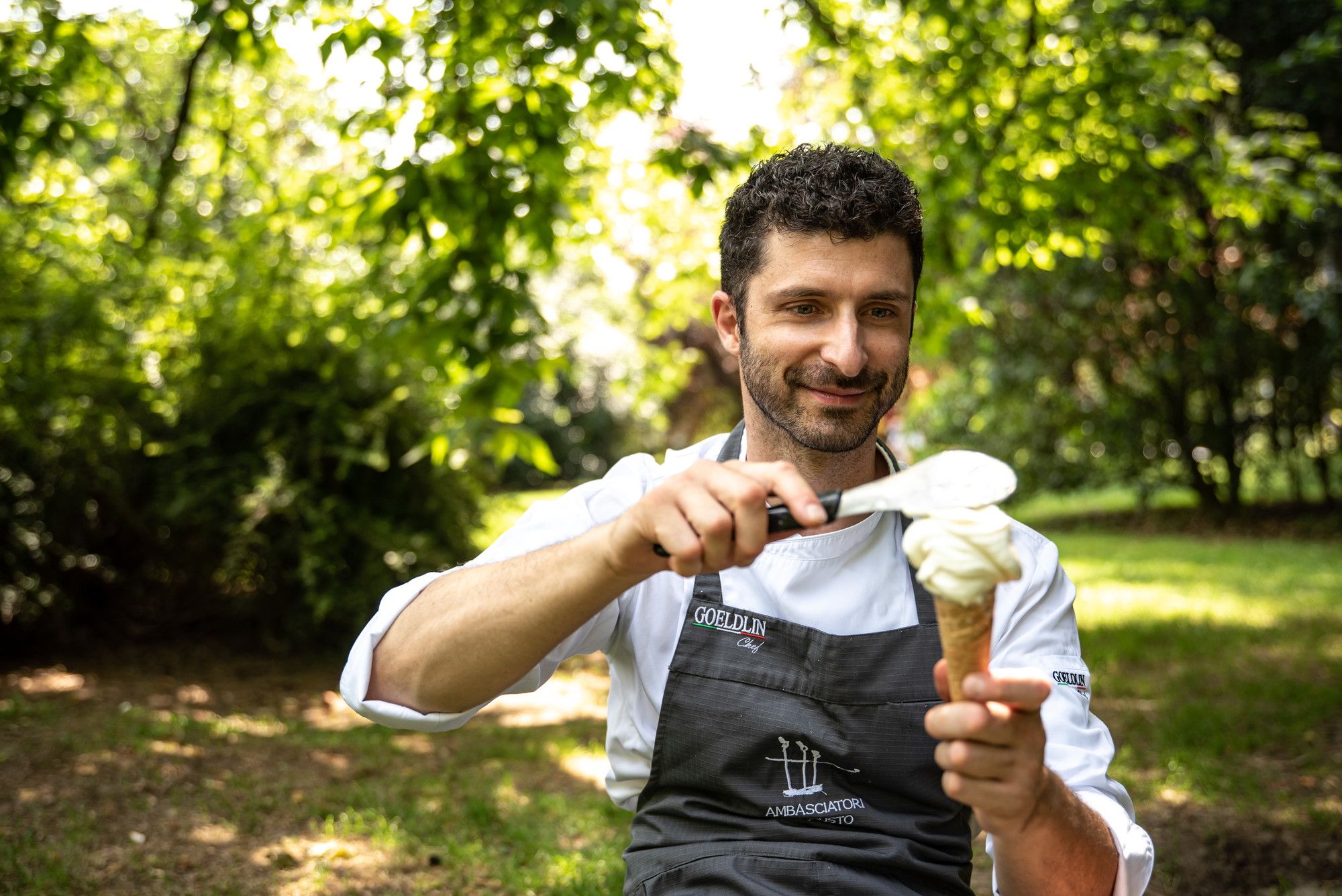 Sorbetto al riso nero, amarena e fiori di rosa: dal colore violaceo, un gelato che porta subito ai frutteti di campagna e ai suoi giardini verdi grazie al sapore delle amarene e quello dello sciroppo di rosa, che viene poi anche nebulizzato direttamente sul cono. Da aggiungere al cono, perle di gelatina alla Bonarda – vino tipico lombardo che richiama alla territorialità e al recupero delle tradizioni.