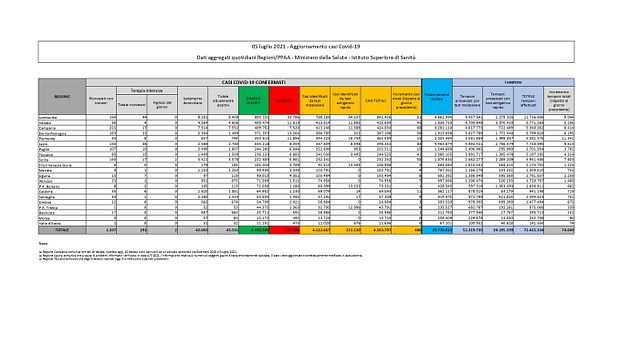 Vaccini - La popolazione italiana sopra i 12 anni d'età vaccinata contro il Covid è salita al 37,8% del totale, con il 63,5% che ha ricevuto almeno una dose. Nelle ultime 24 ore sono state somministrate 506.045 dosi. Nell'ultima settimana sono state inoculate in media 520mila dosi al giorno: a questo ritmo l'immunità di gregge sarà raggiunta tra 19 giorni (il 25 luglio).