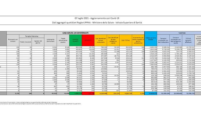Vaccini - La popolazione italiana sopra i 12 anni d'età vaccinata contro il Covid è salita al 40,3% del totale, con il 65,5% che ha ricevuto almeno una dose. Nelle ultime 24 ore sono state somministrate 522.114 dosi. Nell'ultima settimana sono state inoculate in media 525mila dosi al giorno: a questo ritmo l'immunità di gregge sarà raggiunta fra 13 giorni (il 20 luglio).