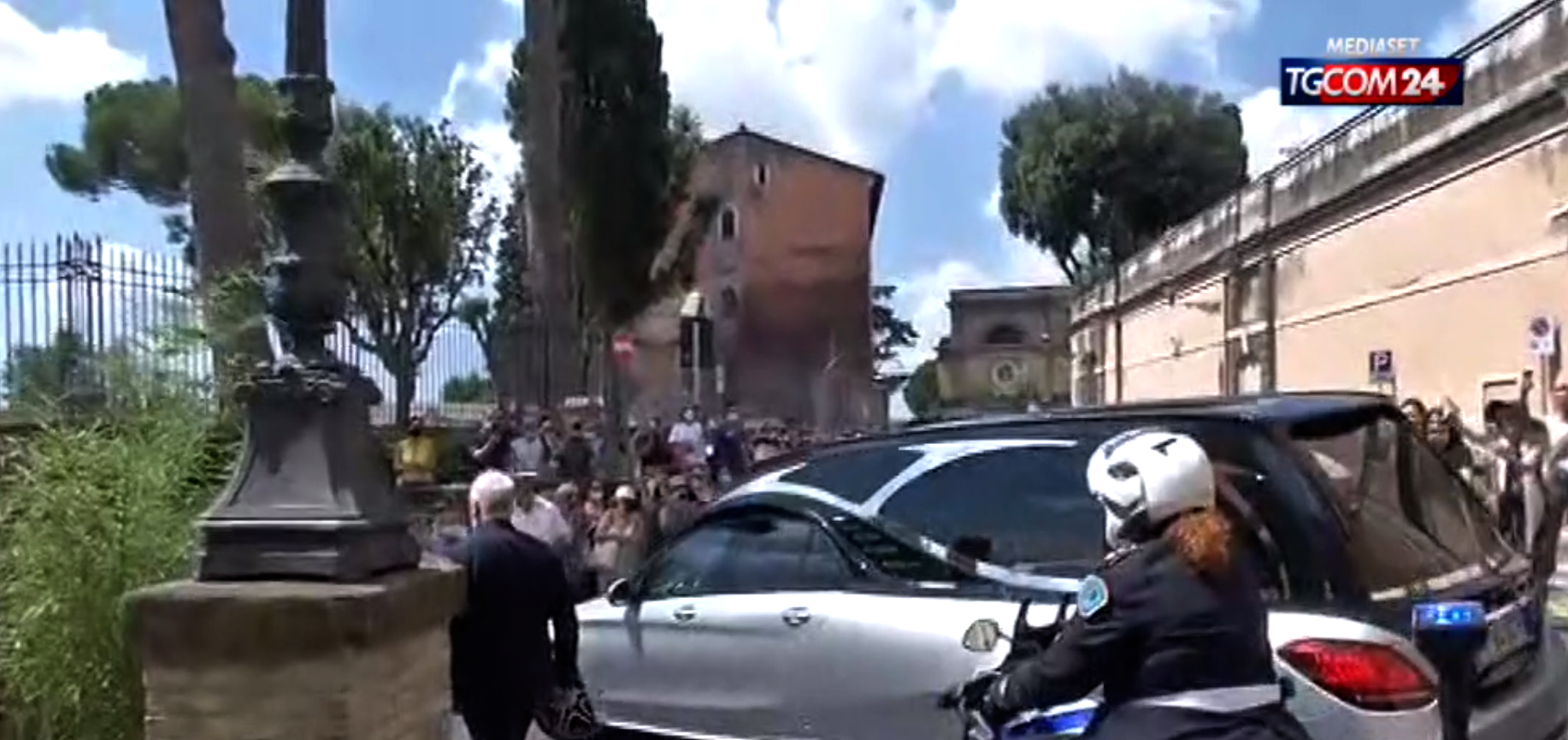 IL FERETRO LASCIA LA CHIESA - Dopo la cerimonia il feretro di Raffaella Carrà ha lasciato la chiesta di Santa Maria in Ara Coeli. All'uscita dalla basilica lunghi applausi e un canto collettivo da parte della folla che scandisce le parole di alcune delle canzoni più popolari dell'artista, da "Ma che musica maestro" a "Ballo ballo". Il feretro è rimasto per diversi minuti sul sagrato per permettere alla lunga fila di parenti e amici di dare l'ultimo bacio, l'ultima carezza alla bara. Poi la partenza, con il carro funebre scortato dagli agenti e ancora tanti tantissimi applausi.