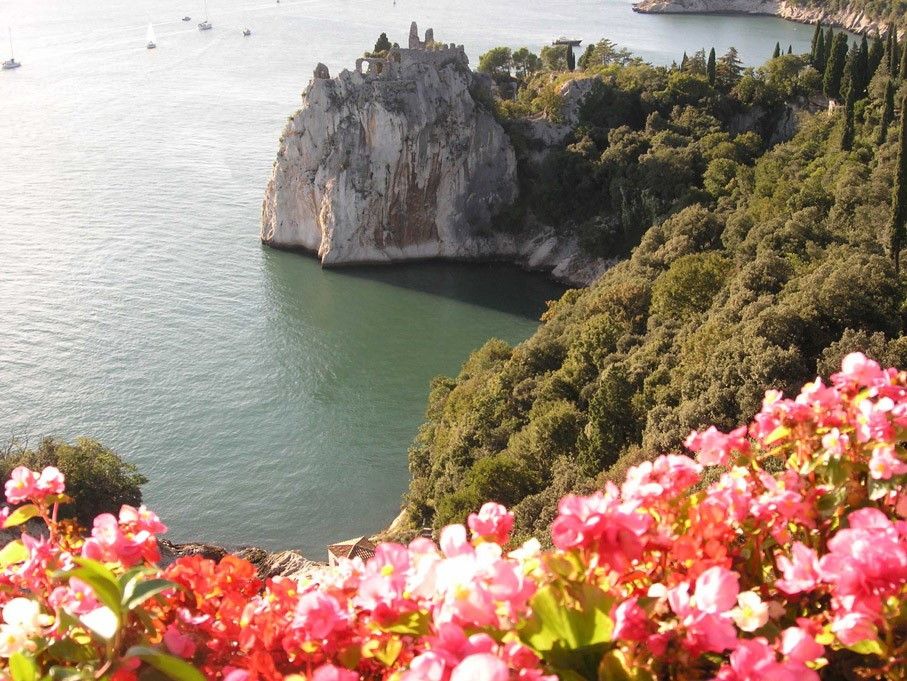 Castello di Duino, Trieste (Friuli Venezia Giulia) - Il Castello di Duino, eretto nel XIV secolo sulle rovine di un avamposto militare romano, sorge in una pittoresca e panoramica posizione, su un carsico sperone roccioso a precipizio sul mare, con una strabiliante veduta del golfo di Trieste. Non passa inosservato il parco impreziosito dai suoi viali romantici, dalle terrazze e dagli spalti aperti sull'immensità del mare, dove si possono ammirare fiori di ogni specie che costituiscono pittoreschi e suggestivi giochi cromatici nella classica vegetazione mediterranea. Molti fiori vengono cambiati stagionalmente e ciclicamente in modo che l’ospite possa ammirare il Castello e la vegetazione che lo circonda in una veste sempre nuova ed unica. In prossimità della splendida passeggiata intitolata al poeta Rainer Maria Rilke, il parco del Castello di Duino si snoda su vari livelli con distese e cascate policrome di fiori di ogni qualità che formano suggestive macchie di colore e fanno da sfondo a statue e all’antico pozzo con l’emblema della famiglia. Il parco del Castello, inizialmente progettato dalla principessa Marie von Thurn und Taxis, è stato poi rinnovato dal principe Raimondo della Torre e Tasso nel 1954. Vengono piantati annualmente più di 21.000 fiori a rotazione periodica: come Nuove Guinee, zigne nane, begonie, ageratum, alissum,… Vista la rara bellezza del suo parco, il Castello è stato scelto come location per film e servizi fotografici.