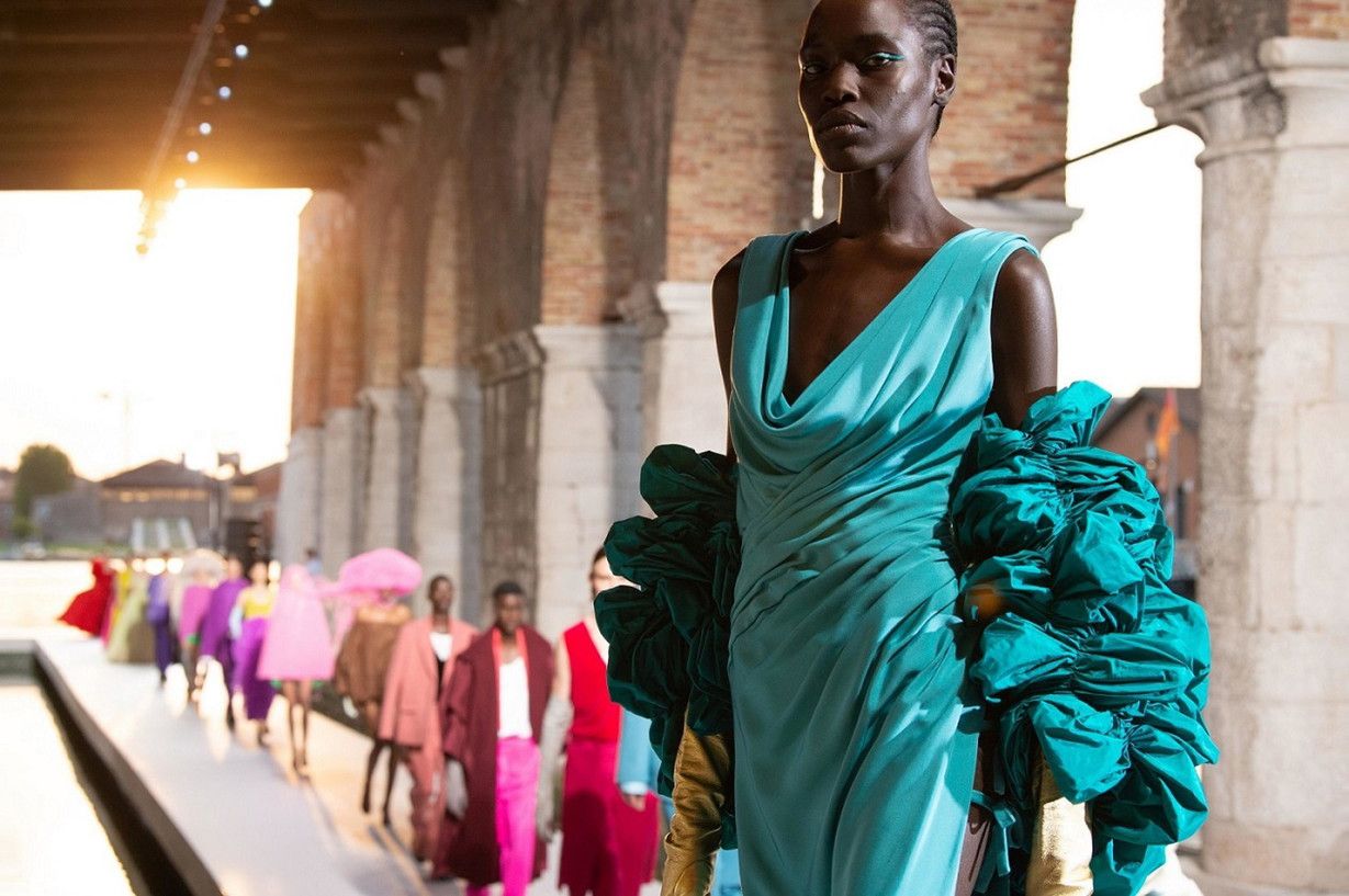 UN INCONTRO DI MONDI - Gli abiti della magnifica collezione di Valentino “Des Ateliers” hanno sfilato davanti all'installazione "Idee di Pietra-Olmo", di Chus Martinez, commissionata dalla Vuslat Foundation per la Biennale Architettura 2021. Di grande effetto, mentre le modelle percorrevano la passerella, i riflessi di colore che i vestiti e i lustrini riverberavano correndo sull'acqua. Venezia ha fatto così, per la prima volta, da palcoscenico per la maison.