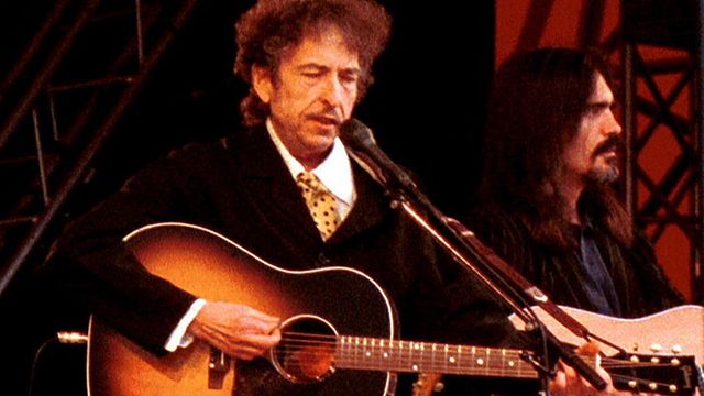 Mr. Tamburine Man ha cantato e suonato, imbracciando una chitarra acustica, con una band di musicisti con la mascherina anti-Covid sul volto: niente pianoforti, tastiere e nemmeno una batteria.