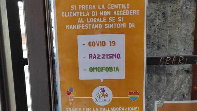 "Solo chi fa scelte banali o mediocri fa contenti tutti, ma felice nessuno". E' con questa convinzione che va dritto per la sua strada Gianfrancesco Cutelli, titolare delle gelaterie De' Coltelli a Pisa e Lucca, balzato agli onori della cronaca per un cartello esposto all'ingresso dei suoi locali e diventato improvvisamente virale sui social. Il messaggio è: "Si prega la gentile clientela di non accedere se si manifestano sintomi di Covid, razzismo e omofobia". "E' lì da un mese - afferma Cutelli a Tgcom24. - Mi fa piacere che abbia avuto successo e ho ricevuto anche molte critiche, ma non ritengo di dover spiegare le mie posizioni né voglio convincere qualcuno. Una cosa è certa, continuerò a fare le cose che mi piacciono e a dire la mia".