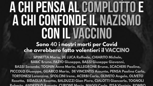Manifesti-shock contro i No Vax per le strade di Castelnuovo Scrivia (Alessandria). A volerli è stato Gianni Tagliani, il sindaco della cittadina piemontese a 4 chilometri dalla Lombardia, che già nella prima ondata di Covid ha pagato al virus un prezzo alto, rispetto a tutto il Piemonte: 40 morti da febbraio 2020. "Dedicato ai No Vax, a chi pensa al complotto e a chi confonde il nazismo con il vaccino", si legge su questi fogli a sfondo nero che riportano l'elenco delle vittime della pandemia, corredati dalla foto del parroco che benedice una bara. "Sono stufo di vedere le piazze piene in questi giorni contro green pass e vaccino, non si calpesta la nostra memoria", spiega a Tgcom24 il primo cittadino, che ha deciso di usare lo stesso linguaggio dei manifestanti con un messaggio diretto.