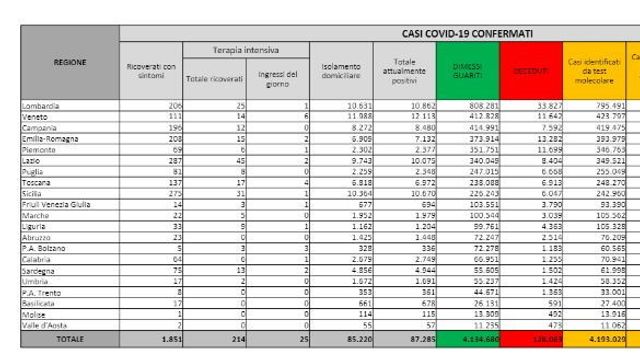 Complessivamente sono 214 i pazienti ricoverati in terapia intensiva. Gli ingressi giornalieri, secondo i dati del ministero della Salute, sono stati 25. I ricoverati con sintomi nei reparti ordinari sono 1.851.