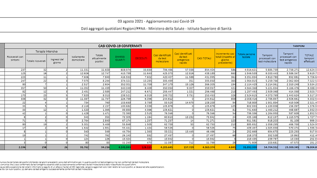 I ricoverati con sintomi nei reparti ordinari sono 2.196, 126 in più rispetto a ieri. I casi in Italia dall'inizio dell'epidemia sono 4.363.374. I dimessi e i guariti sono invece 4.141.043, con un incremento di 3.615 rispetto a ieri. Gli attualmente positivi sono 94.216, in aumento di 1.199 unità nelle ultime 24 ore.