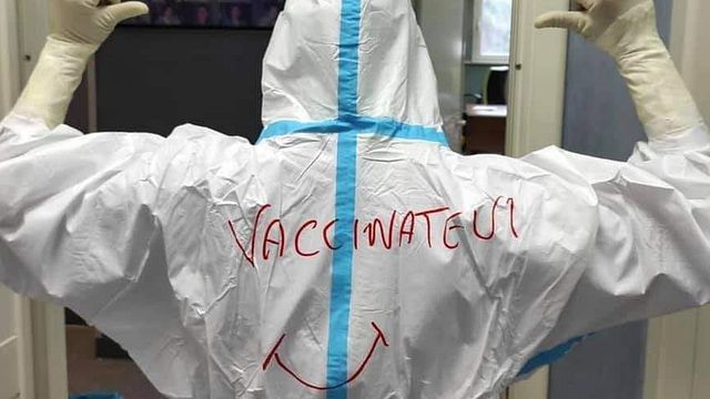 Un messaggio positivo: la scritta vaccinatevi e un sorriso, disegnati sul dorso della tuta che ogni giorno infermieri e medici devono indossare nei reparti per difendersi dal Covid-19.