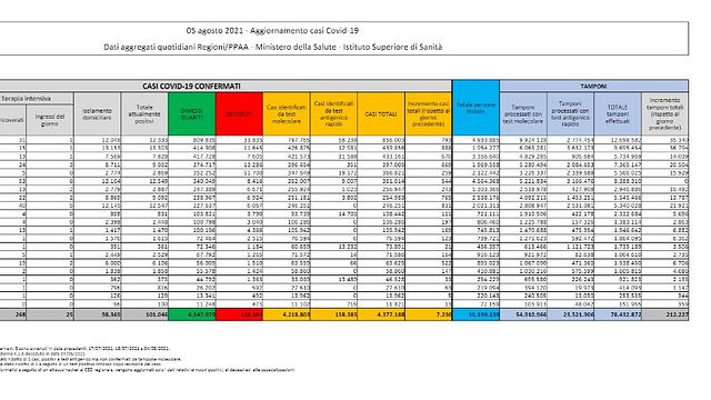 I dati sui guariti portano il totale a 4.147.979, mentre sono 128.163 i decessi da inizio pandemia. Sono 268 i pazienti ricoverati in terapia intensiva per il Covid in Italia. Gli ingressi giornalieri, secondo i dati del ministero della Salute, sono 25 (ieri erano 14). I ricoverati con sintomi nei reparti ordinari sono 2.409.
