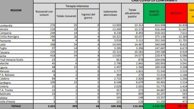 I numeri della pandemia Sono 299 i pazienti ricoverati in terapia intensiva per il Covid in Italia, 11 in più rispetto a sabato nel saldo tra entrate e uscite. Gli ingressi giornalieri sono 24. I ricoverati con sintomi nei reparti ordinari sono 2631, 98 in più rispetto a ieri. Gli attualmente positivi salgono a 112.266 con un aumento di 3.731 nelle ultime 24 ore.