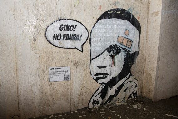 A Roma, in via Andrea Provana, è apparsa una nuova opera della street artist Laika, dal titolo: "Le lacrime di Kabul (omaggio a Gino Strada)". E' ritratto un bambino afghano, con bende sulla testa e sull'occhio destro, che si rivolge a Gino Strada e dice di avere paura. Il piccolo piange, le sue lacrime hanno il colore della bandiera afghana e rappresentano la sofferenza di un intero popolo. La paura di un futuro pieno di violenze e sofferenze.