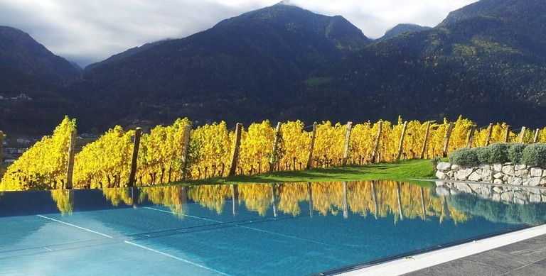 Vista sui vitigni Traminer - Una piscina naturale con vista sul vitigno del Gewürztraminer. È la proposta dell’Hotel Plattenhof di Termeno sulla Strada del Vino nella zona vinicola Bassa Atesina. La piscina panoramica outdoor è dotata di un sistema di filtraggio automatico naturale, l’unico finora in Alto Adige, per questo, pur essendo stata realizzata artificialmente, si è guadagnata il titolo di “piscina naturale”. L’acqua è riscaldata tutto l’anno e la piscina è immersa in un paesaggio naturale davvero unico, vicino al Lago di Caldaro. I vigneti che circondano la piscina sono coltivati da oltre 400 anni dalla famiglia Dissertori e producono un ottimo Gewürztraminer.
