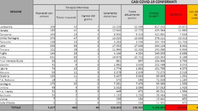 Nella somma complessiva delle nuove vittime nell'ultimo bollettino sono stati conteggiati dieci decessi in più, che riguardano i giorni precedenti (8 in Calabria e due in Sicilia). Dall'inizio della pandemia i casi sono 4.464.005, i morti 128.634. Gli attuali positivi salgono a 130.502 con un aumento di 1.720 casi nelle ultime 24 ore.