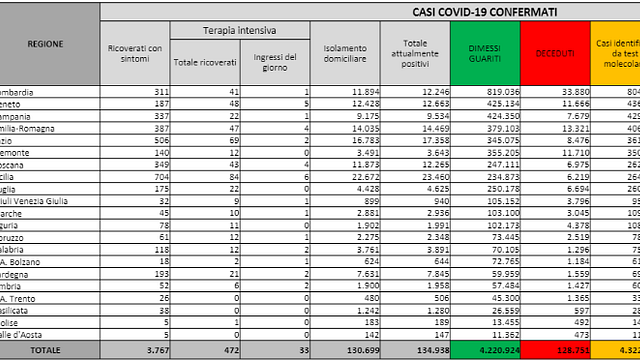 Ricoveri in aumento - Aumentano i ricoveri: +6 in intensiva e +34 in reparti ordinari. E' quanto emerge dal bollettino del ministero della Salute. Il totale dei guariti da inizio pandemia è di 4.220.924 persone. I ricoverati con sintomi sono 3.767 mentre in isolamento domiciliare ci sono 130.699 persone. Gli attualmente positivi nel nostro Paese sono 134.938. Il tasso di positività (al 3,4%) è in aumento dello 0,4% rispetto a sabato.