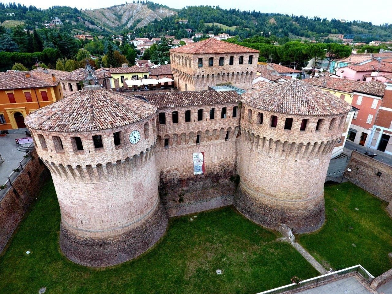 La Rocca di Imola (Bo) - E' uno splendido esempio di architettura fortificata tra Medioevo e Rinascimento. Le sue origini risalgono al 1261. Sul perimetro della struttura originaria s’impostavano ben nove torri quadrangolari, solo una decima torre, il mastio, campeggia tuttora al centro del cortile interno. La Chiesa di Roma, le nobili famiglie degli Alidosi, dei Visconti poi dei Manfredi guidarono Imola e la Rocca. È però alla fine del Quattrocento che si avviò con gli Sforza la completa trasformazione rinascimentale dell’edificio che proseguì col nuovo signore di Imola Girolamo Riario, nipote di papa Sisto IV e sposo di Caterina Sforza. A partire dal 1480 le torri angolari quadrate vennero inglobate entro nuovi e più spessi torrioni circolari capaci di resistere ai colpi delle bombarde. Il Valentino ricorre poi nel 1502 alla consulenza di Leonardo da Vinci per ispezionare le fortezze romagnole tra cui quella imolese: ne è testimonianza la pianta di Imola che Leonardo stese, dove è ben visibile anche la Rocca.