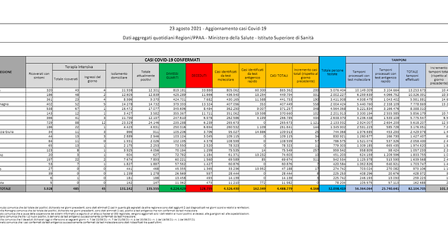 In Sicilia 1.121 i nuovi positivi, 20 i morti Sono 1.121 i nuovi casi registrati nelle ultime 24 ore nell'isola a fronte di 12.565 tamponi processati in Sicilia. L'incidenza scende al 9%, ieri era al 12% . L'isola nettamente resta al primo posto per nuovo contagio giornaliero. Segue l'Emilia Romagna con 558 contagi. Gli attuali positivi sono 24.146 con un aumento di altri 686 casi. I guariti sono 415 mentre nelle ultime 24 ore si registrano 20 vittime e il totale dei decessi resta a 6.239. La Regione Sicilia comunica che i deceduti dichiarati oggi si riferiscono ai seguenti giorni: 7 del 22 agosto, 7 del 21 agosto, 4 del 20 agosto, 1 del 19 agosto, 1 del 6 luglio. Sul fronte ospedaliero sono adesso 817 i ricoverati, 29 in più rispetto al giorno precedente mentre in terapia intensiva sono 88, quattro ricoverati in più rispetto a ieri. Sul fronte del contagio nelle singole province la situazione è la seguente: Palermo 348, Catania 296, Messina 4, Siracusa 133, Ragusa 80, Trapani 67, Caltanissetta 103, Agrigento 2, Enna 88.