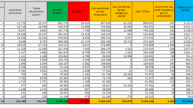 Aumentano anche i ricoverati negli altri reparti Covid, che sono 22 in più rispetto a sabato, per un totale di 4.133. Dall'inizio della pandemia si contano 4.530.246 casi e 129.093 vittime. Tra guariti e dimessi, il numero complessivo è di 4.260.106 persone. Aumentano gli attualmente positivi, che sono 141.047, cioè 1.619 in più.