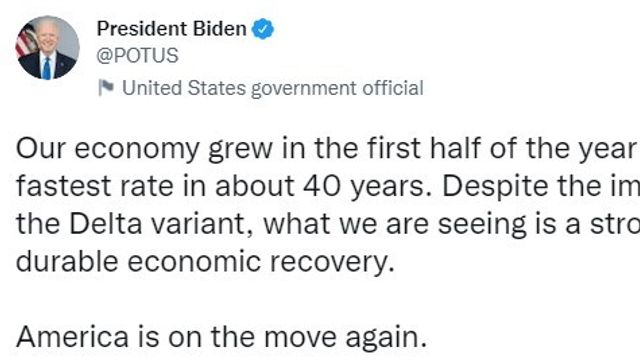 "La nostra economia è cresciuta nella prima metà dell'anno al tasso più veloce degli ultimi 40 anni". Lo scrive su Twitter Joe Biden, aggiungendo che i risultati economici arrivano "nonostante l'impatto della variante Delta, quello che stiamo vedendo è una ripresa forte e duratura". "L'America è di nuovo in movimento", ha poi concluso.