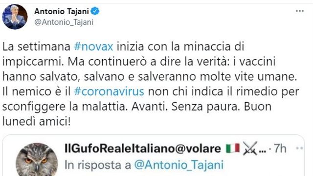 "La settimana No vax inizia con la minaccia di impiccarmi". A denunciarlo, con un post su Twitter, è il coordinatore nazionale di Forza Italia, Antonio Tajani, che pubblica l'immagine di un post nel quale si vede l'impiccagione di Karl Brandt, generale nazista condannato a morte a Norimberga. ""Continuerò a dire la verità - sottolinea però Tajani -: i vaccini hanno salvato, salvano e salveranno molte vite umane".