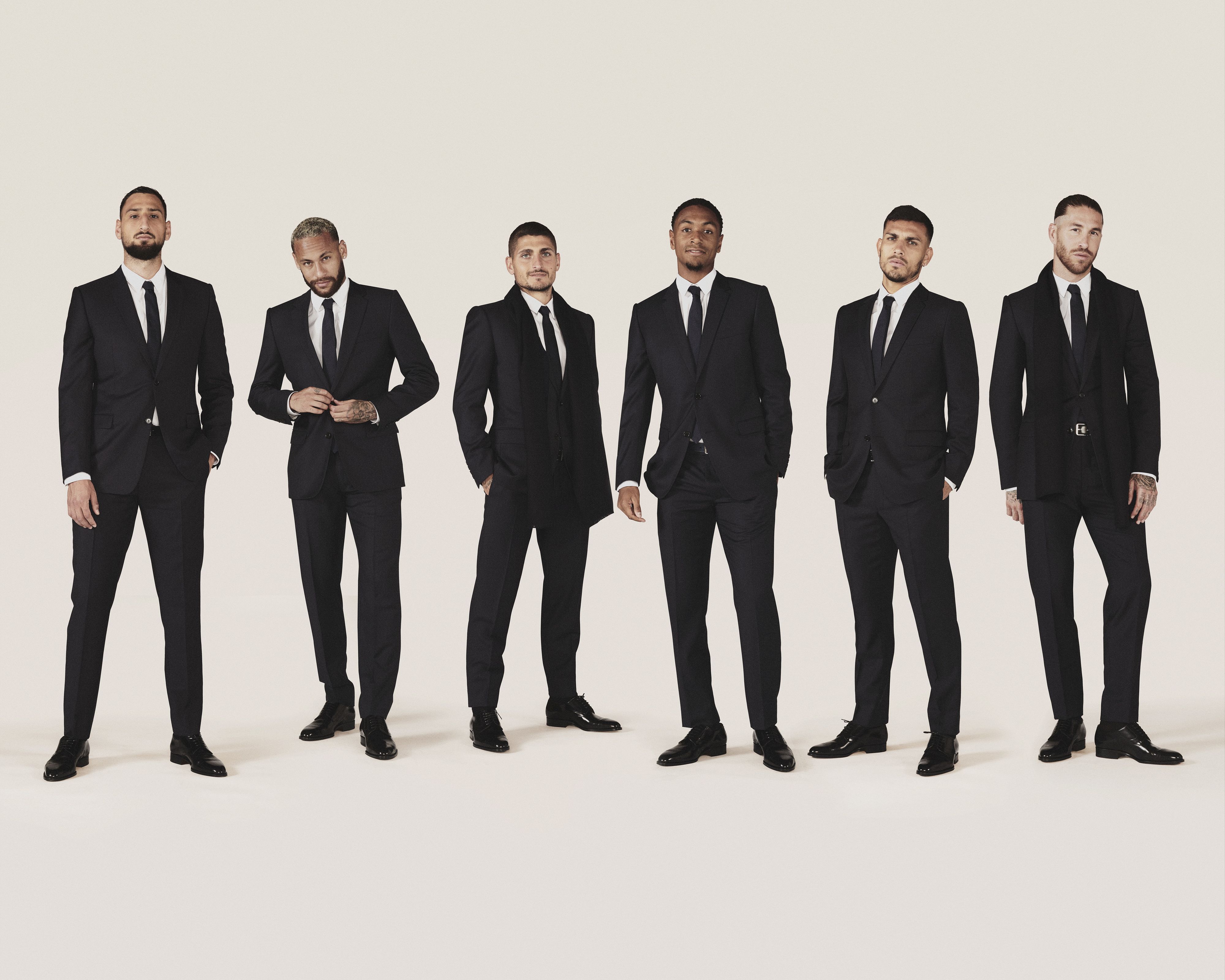 Un guardaroba maschile composto di capi "must have". Un completo casual, che prevede una giacca sportiva modello Harrington, un maglione, una polo in maglia e scarpe Derby in pelle nera. E un secondo, elegante e formale, che punta su cappotto, giacca, camicia e pantaloni in cashmere. Il tutto, nero e blue navy, in un tono creato ad hoc. Così Kim Jones, direttore artistico delle collezioni uomo Dior, ha concepito le nuove creazioni dedicate al Paris Saint Germain di "Gigio" Donnarumma, Neymar Jr, Marco Verratti, Sergio Ramos e compagni di squadra.
