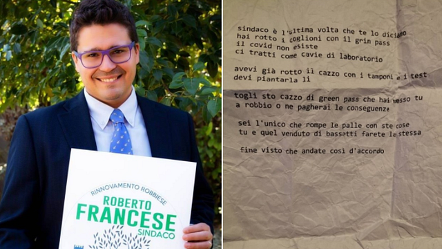 "Sindaco è l'ultima volta che te lo diciamo. Hai rotto col Green pass. Il Covid non esiste. Ci tratti come cavie da laboratorio": sono le minacce riportate in un biglietto consegnato a Roberto Francese, sindaco di Robbio, in provincia di Pavia. Una lettera anonima in cui si chiede al primo cittadino di non applicare nel suo Comune la normativa sul certificato verde. E che lui ha deciso di condividere sui social.