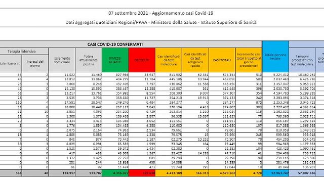 I numeri della Sicilia - Proprio in Sicilia nelle ultime 24 ore sono stati effettuati 24.465 tamponi. L'incidenza quasi si dimezza passando dal 7,4% di lunedì al 3,6% odierno. L'isola resta sempre la prima regione per numeri di nuovi contagi giornalieri seguita dal Veneto con 583 casi. Gli attuali positivi sono 28.547 con un decremento di 404 casi. I guariti sono 1.250, mentre si registrano altre 29 vittime che portano il totale dei decessi a 6.484. La regione Sicilia comunica che i decessi odierni sono riferiti: tre al 7 settembre, cinque al 6 settembre, 12 al 5 settembre, cinque al 4 settembre e quattro al 3 settembre. Sul fronte ospedaliero sono adesso 966 i ricoverati, nove in meno rispetto a lunedì mentre in terapia intensiva sono 116, quattro in meno rispetto al giorno precedente.