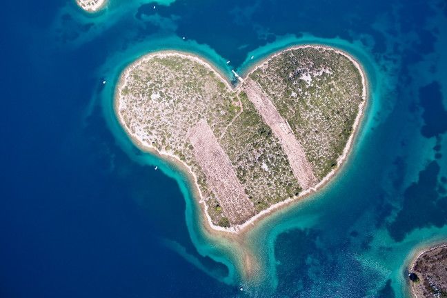 IL CUORE: Galešnjak, Croazia – Questa isola celeberrima e super fotografata, regala la visuale di un cuore perfetto. Ovviamente è considerata luogo ideale per gli innamorati: a chi desidera visitarla ricordiamo che l'isolotto si trova nel mare Adriatico, in Croazia, all’altezza di Zara, tra l'isola di Pasman e il centro abitato di Torrette nel comune di Zaravecchia.