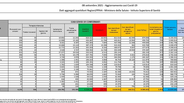 Dall'inizio della pandemia i casi sono 4.590.941, i morti 129.766. I dimessi e i guariti sono invece 4.331.257, mentre gli attualmente positivi 129.918, con un calo di 1.663 casi nelle ultime 24 ore.