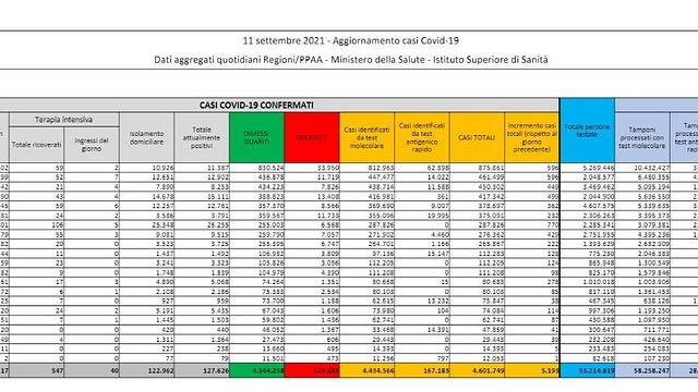 -863 attulamente positivi Dall'inizio della pandemia i casi di coronavirus totali sono 4.601.749. I dimessi e i guariti sono invece 4.344.238, mentre gli attualmente positivi sono 127.626, con un calo di 863 casi nelle ultime 24 ore.