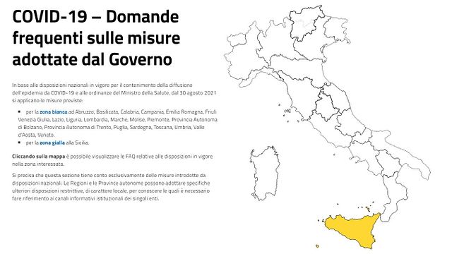 La Sicilia resta in zona gialla per altri 15 giorni. Lo prevede la nuova ordinanza "Misure urgenti di contenimento e gestione dell'emergenza sanitaria nella Regione Sicilia" del ministero della Salute. "Allo scopo di contrastare e contenere il diffondersi del virus SARS-Cov-2, per la Regione Sicilia è rinnovata per ulteriori quindici giorni, ferma restando la possibilità di una nuova classificazione". La Sicilia è in zona gialla dal 27 agosto.