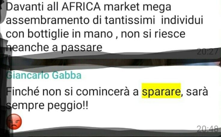 Nel botta e risposta, Simona Virgilio, assessore all'Istruzione del Comune di Voghera, segnala ai colleghi: "Davanti all'Africa market mega assembramento con tantissimi individui con bottiglie in mano, non si riesce neanche a passare". A rispondere è proprio Giancarlo Gabba, della Lega, che all'epoca ricopriva il ruolo di assessore all'Urbanistica: "Finché non si comincerà a sparare, sarà sempre peggio".