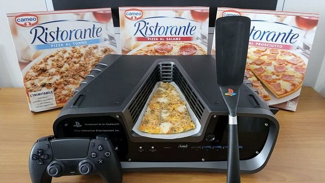Nelle fotografie del prodotto si può chiaramente vedere la fetta accuratamente posta nello spazio a V al centro del devkit di PS5: la persona si è anche presa la briga di applicare un logo PlayStation alla spatola che ha utilizzato per posizionare la pizza. Il tutto per la modica cifra di 6050 euro, spedizione esclusa.