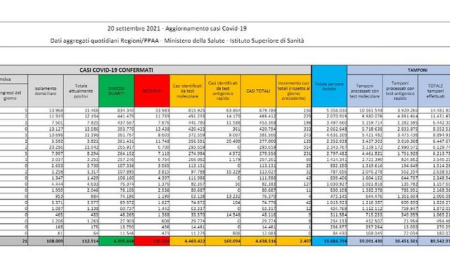 I numeri della pandemia Nelle ultime 24 ore i guariti sono stati 3.383. Diminuiscono i pazienti ricoverati in terapia intensiva per il Covid: sono 523, con un calo di 7 unità rispetto a ieri nel saldo tra entrate e uscite. Gli ingressi giornalieri sono invece 21. I ricoverati con sintomi nei reparti ordinari sono 3.982, con un aumento di 53 rispetto a domenica. Gli attualmente positivi sono 112.514, con un calo di 1.022 casi nelle ultime 24 ore.
