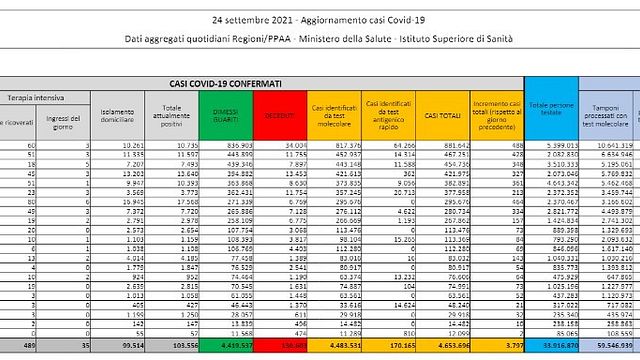 In Italia ci sono 3.797 nuovi casi di coronavirus a fronte di 277.508 tamponi effettuati (mentre il giorno precedente l'incremento era stato di 4.061 con 321.554 test). Nelle ultime 24 ore sono stati registrati altri 52 decessi (contro i 63 di giovedì) per un totale, da inizio pandemia, che arriva a 130.603. In terapia intensiva sono ricoverati 489 pazienti (-16) mentre i guariti sono 5.265. Tasso di positività all'1,4%.