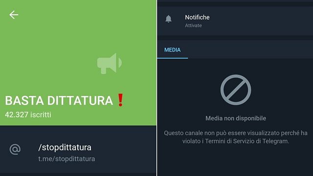 “Questo canale non può essere visualizzato perché ha violato i termini di servizio di Telegram". Non si può più accedere al canale Basta Dittatura, la chat No Vax che coordinava molte delle azioni No Green pass in Italia, dalle manifestazioni di piazza all’azione di boicottaggio di ristoranti e dei bar che chiedono la carta vaccinale per l’ingresso. La procura di Torino aveva chiesto la chiusura del canale chiedendo un dispositivo di sequestro.