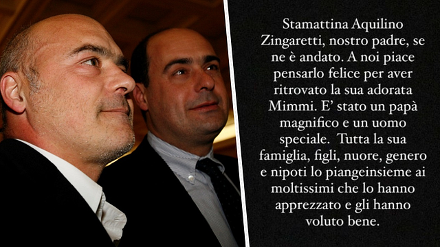 "Stamattina Aquilino Zingaretti, nostro padre, se ne è andato". Così l'attore Luca Zingaretti ha annunciato sui social la morte del papà a nome suo e del fratello Nicola, governatore del Lazio. Un messaggio su sfondo nero condiviso tra le storie di Instagram.