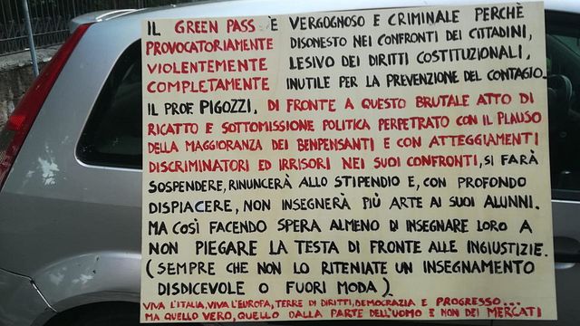 Il docente ha spiegato di sentirsi "affranto", oltre che "orfano dal punto esistenziale e politico di un enorme pezzo della società civile evaporato di fronte alla paura". Per Pigozzi le proteste in piazza contro il Green pass sono state "un momento di democrazia vera, pulita e diretta, non degnamente rappresentata e comunicata".