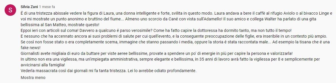Tra il 22 luglio e il 20 agosto, Silvia Zani, arrestata pochi giorni fa con la sorella Paola e il fidanzato Mirto Milani, ha pubblicato lunghi messaggi. Spesso parlando in terza persona e chiamando la madre "Laura". Commentando la trasmissione "Estate in diretta" del 22 luglio scrisse: "Forse mia madre non è più in vita, ma con lei da quella casa è uscito per non tornare più anche il futuro di una famiglia, la mia famiglia, fragile, discreta, ma resiliente, che non si è mai sgretolata, che è sempre rimasta forte nonostante tutto, ma che adesso non esiste più". "Vorrei che fossi qui con me: non riesco - scriveva - a vivere senza di te, tu che hai sempre creduto in me, in noi. Spero che questo mistero venga svelato, spero di rivederti ancora, se no penso che ti raggiungero' presto".