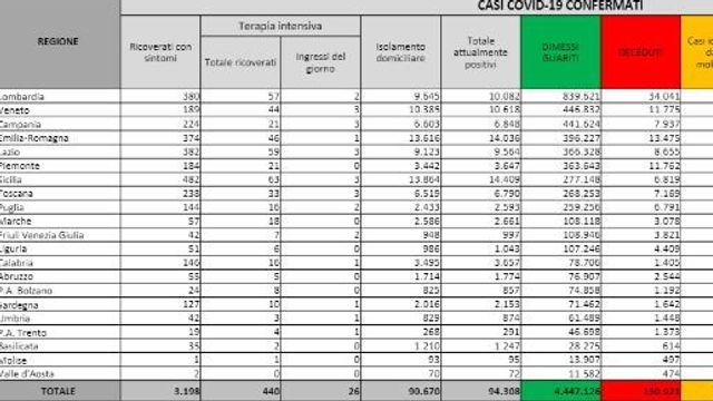 Gli attualmente positivi ammontano a 94.308, con un calo di 1.671 nelle ultime 24 ore. Dall'inizio della pandemia i contagi sono 4.669.355, mentre i morti 130.921. I dimessi e i guariti sono invece 4.447.126.